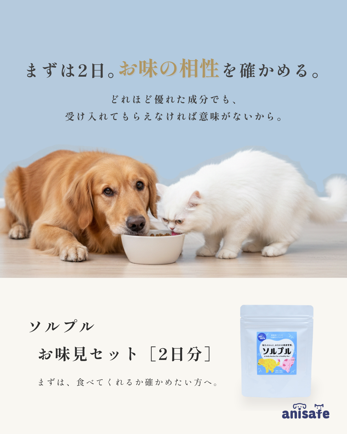 ソルプルは、続けやすさにこだわって私たちが開発しましたが、食のこだわりがそれぞれ違うのも、犬猫ちゃんたちの個性です。まずは、あなたのお家で無理なく続けられるか、この『お味見セット』で、相性を確かめてみてください。